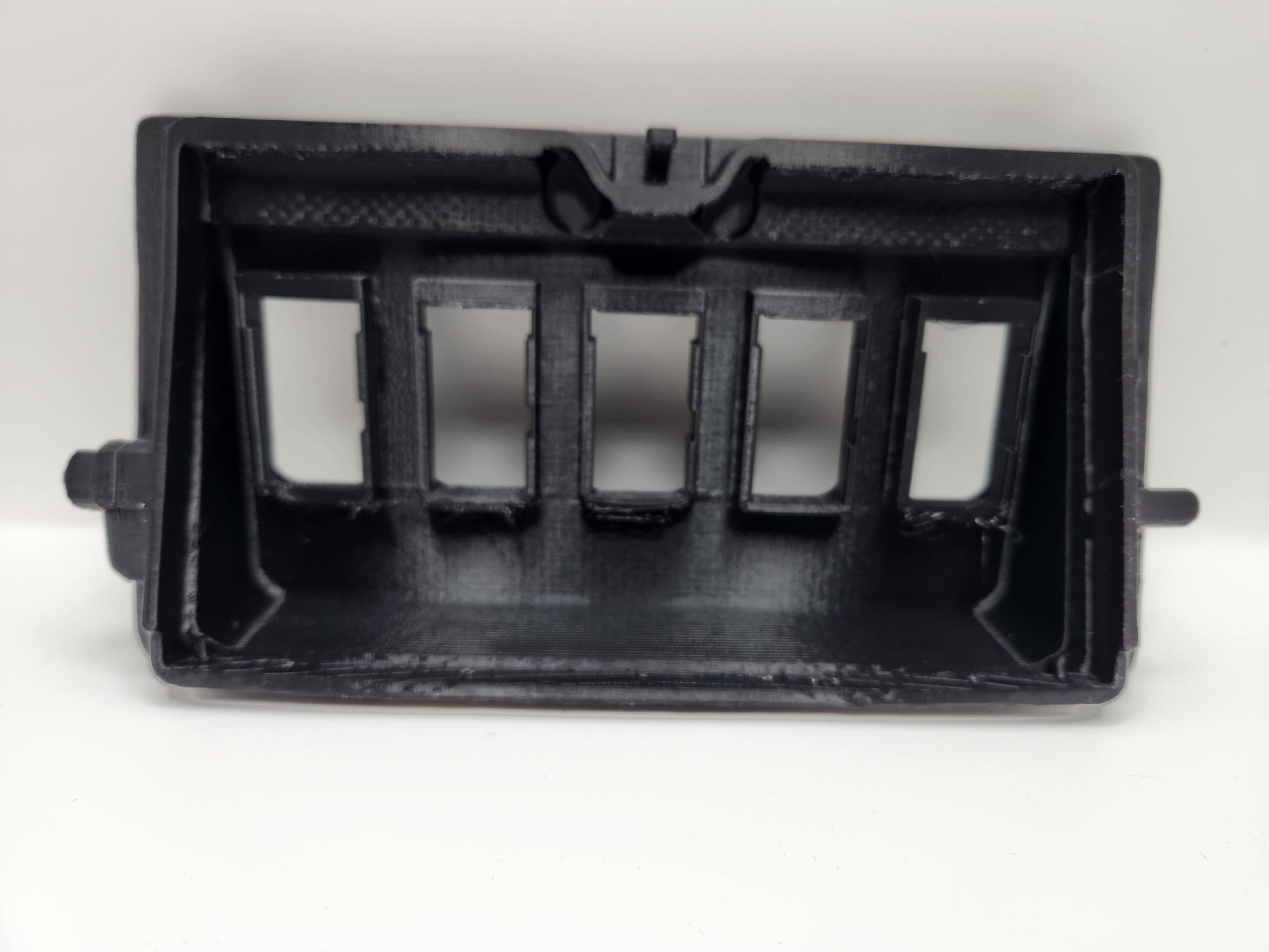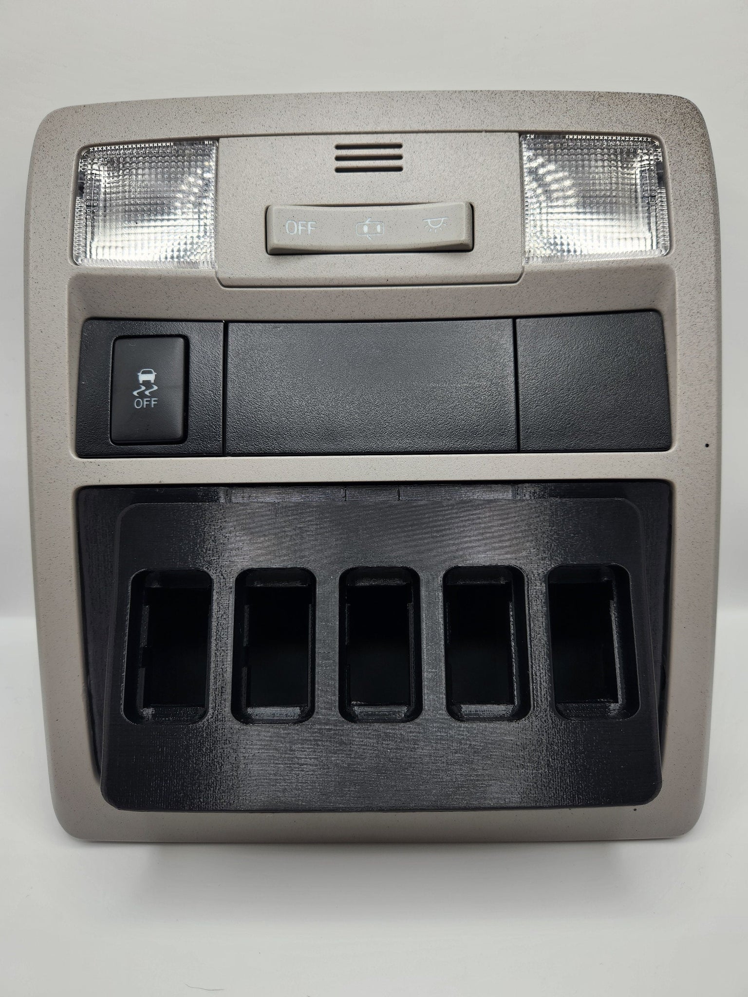 Customize your 2016+ 3rd gen Toyota Tacoma with our 3D Printed OEM Short Style Switch Panel, a direct replacement for the stock overhead sunglass holder. This panel can be used to create custom switches for anything from auxiliary lighting, fog lights, air compressors, light bars, and more. It comes with 5 empty slots that will fit OEM Short Style Toyota switches, which can be found on Ebay or various other sites. This is the same style of Toyota switch that comes with this model of Tacoma which has a face surface size of 1.28″ x 0.87″ (32.5 mm x 22 mm). These do not fit the longer more narrow style Toyota switches.