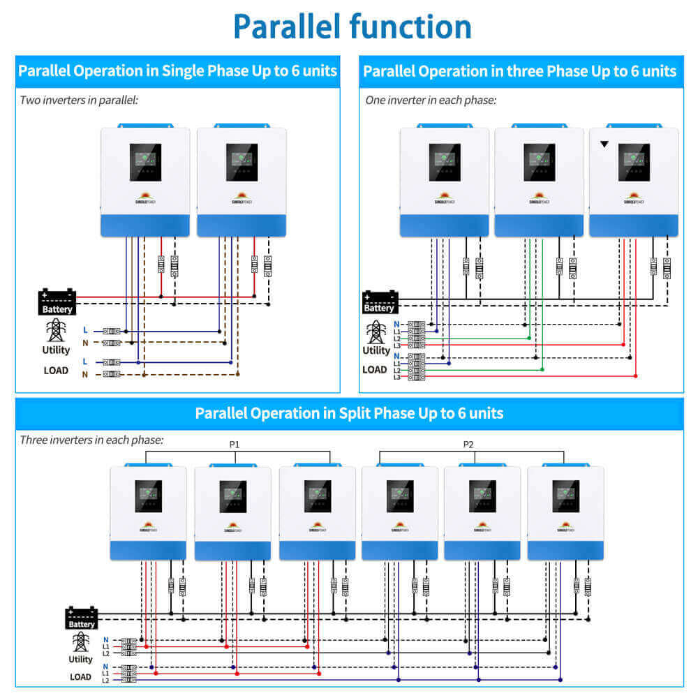 • SPH5048P Parallel Kit: Parallel 6 units up to 30kw power output, you will get 120V single phase,120V/240V Split Phase capable (more than 2 unit in parallel),208V 3-Phase Support (more than 3 unit in parallel),  increases the inverter power and surge capacity.