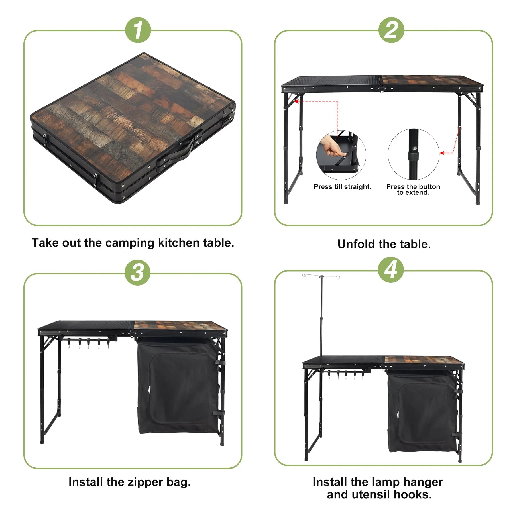 • Package include: A table, lamp hanger, utensil hooks, storage bag